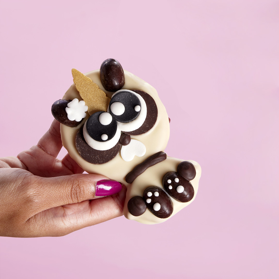 Ingredienti: cioccolato bianco (26%) (24% minimo di cacao) (zucchero, burro di cacao, LATTE intero in polvere, emulsionante: lecitina di SOIA, aroma naturale di vaniglia), farina di GRANO tenero, BURRO, zucchero a velo (zucchero, amido di mais), cioccolato fondente (5%) (55% minimo di cacao) (pasta di cacao, zucchero, burro di cacao, emulsionante: lecitina di SOIA, aroma naturale di vaniglia), fecola di patate, pasta di zucchero [zucchero, sciroppo di glucosio, grassi vegetali (palma, cocco), amido di mais, umidificante: glicerolo, acqua, addensante: gomma di xantano, aroma naturale di vaniglia], tuorlo d’UOVO, albume d’UOVO, aroma vaniglia, coloranti: E153, E172. Può contenere ARACHIDI, MANDORLE, PISTACCHI e NOCCIOLE.
